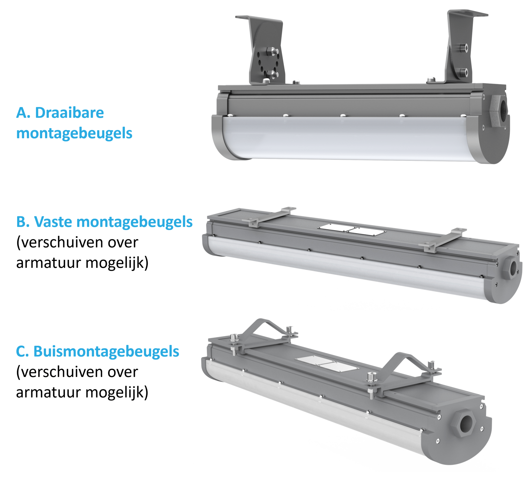 De ATEX Tri-proof LED armatuur wordt geleverd met bevestigingsbeugels waarmee het armatuur eenvoudig gemonteerd kan worden. Met deze beugel kan de hoek van de armatuur ook eenvoudig worden bijgesteld.